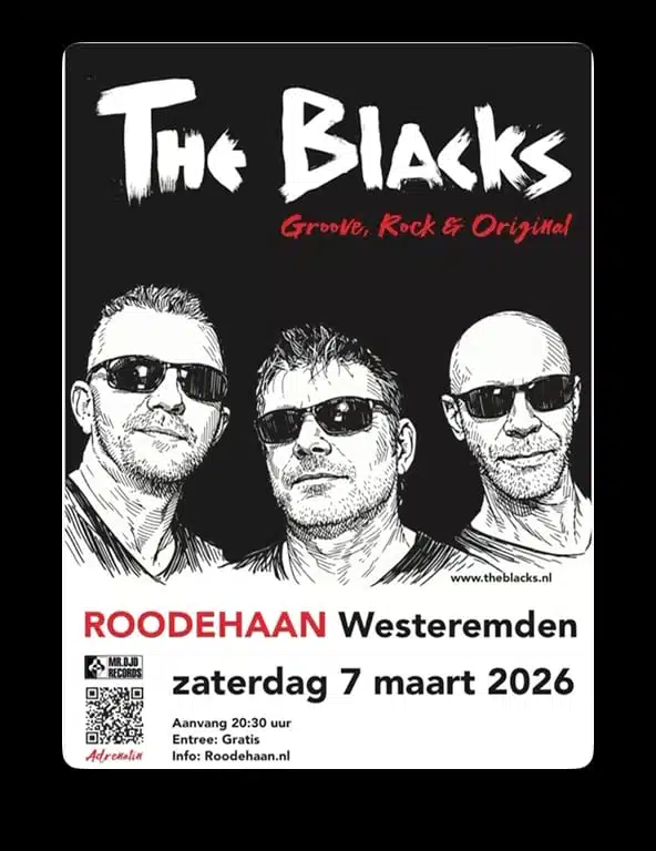 Op zaterdag 7 maart 2026 staan The Blacks op het podium van Roodehaan in Westeremden. Drie rock veteranen die voluit gaan met een avond vol Groove, Rock & Original. En dat gratis ook nog. Aanvang 20:30 uur. Voor alle diehards die de Northern Rock een warm hart toedragen: dit wil je niet missen. Meer info: roodehaan.com